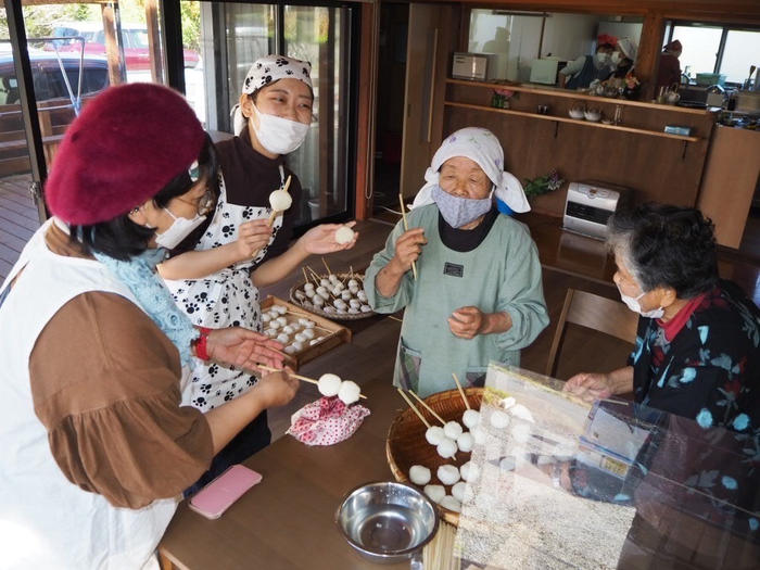 お店を貸し切って、身内だけで五平餅をみんなで手作り。話し手のおばあちゃんたちに五平餅の作り方を習いながら、とても和やかな交流が出来ました。